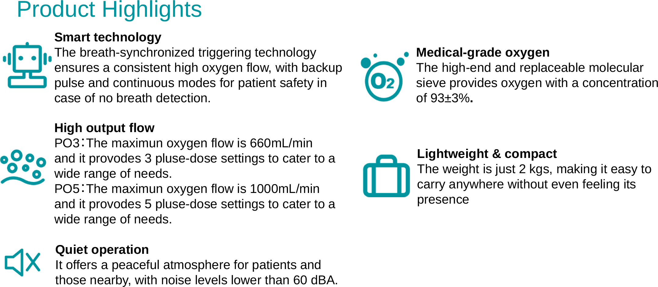 PO3/PO5 is a compact yet powerful portable oxygen generator that efficiently provides enriched oxygen air through advanced molecular sieve technology.